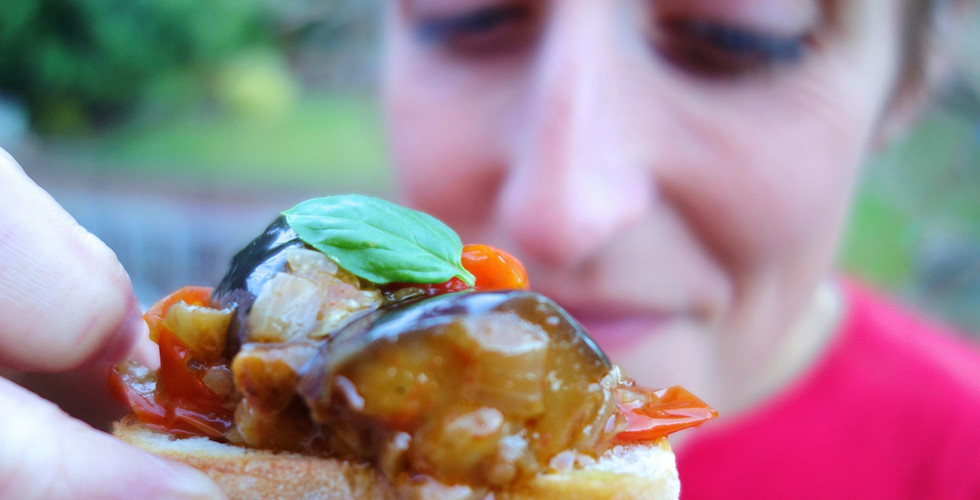 7. Toast your little crostini, give it a friendly rub with raw garlic, and slop on your caponata.
